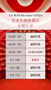 平素は「YA-MAN the store GINZA」をご愛顧頂き、誠にありがとうございます。誠に勝手ながら、年末年始休業日を下記の通りとさせていただきます。