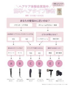 診断チャートを使用し、6つのタイプで診断。お客様の髪質やお悩みをお伺いし、ぴったりなヘアケア製品をご提案いたします。気になる製品は実際にお試しいただけます。