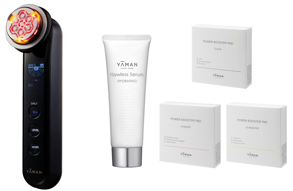 全11機能を集約した複合型美顔器『フォトプラス プレステージ SP Ⅲ』。2026年4月20日(月)までにご購入いただくと、美顔器と併用してご利用いただける『パワーブースターパッド』 3種(各15枚)と『フローレスセラム ハイドレイティング』(80g)をお付けいたします。